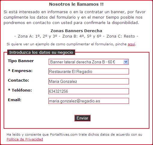 Si está interesado en informarse o en la contratar un banner, por favor cumplimente los datos del formulario y en el menor tiempo posible nos pondremos en contacto con usted para confirmarle la disponibilidad.